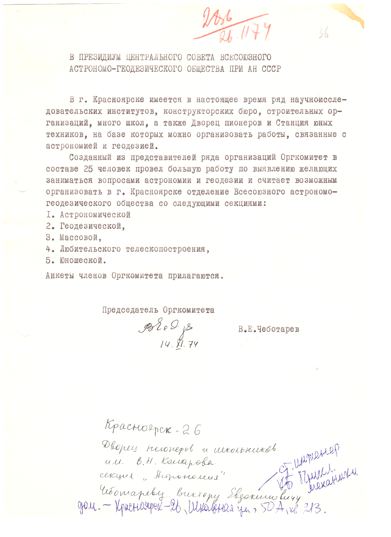 Решение комитета депутатов трудящихся о регистрации в городе Красноярск 16, отделения Астрономо-Геодезического Общества (ВАГО), от 03.06.1975 года